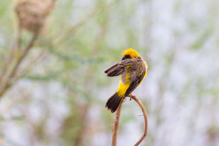 Village Weaver - Ploceus cucullatus, beautiful yellow and black perching bird from African woodlands and gardens, lake Ziway, Ethiopia.