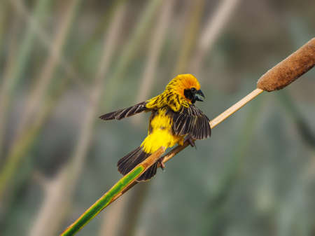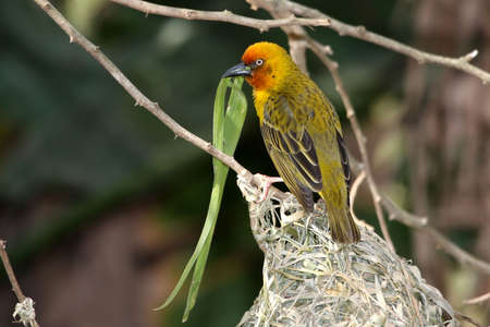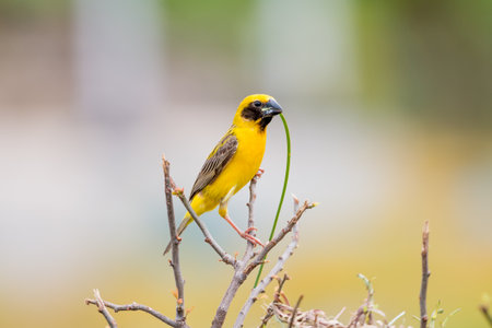 Breeding male cape weaver bird with a blade of grass in it's beak