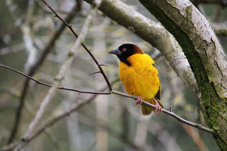 A male asian golden weaver is perching on a tree branch.
