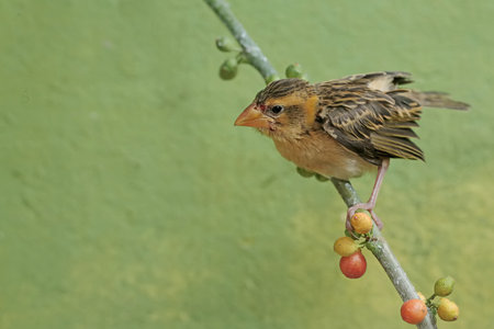 Little bird on a branch with fruits in its beak and green background