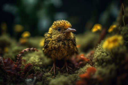 A vibrant bird with blue and yellow plumage rests on a mossy surface. The composition showcases the bird against a backdrop of blurred green vegetation. The earthy tones of the ground contrast with the bird's bright colors, suggesting a natural outdoor environment suitable for various commercial uses.