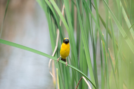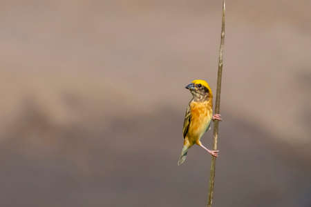 Asian Golden Weaver perching on grass stem in paddy field. Ploceus hypoxanthus bird in tropical forest