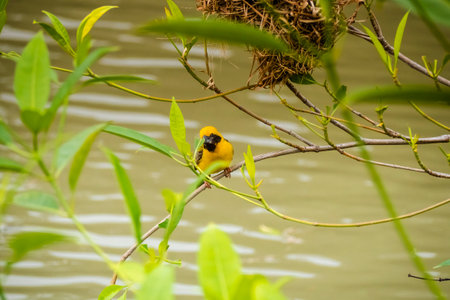 Asian golden weaver hold on the branch nerby his nest on the lake,Boraped Thailand