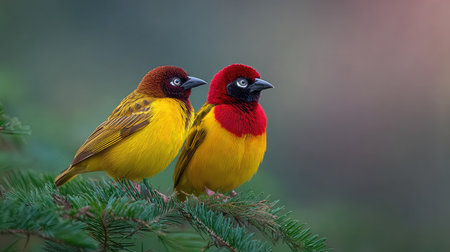 Two vibrant birds with yellow and red plumage are perched on a tree branch. Their features are detailed, set against a soft, out-of-focus background. The image exhibits natural lighting and a balanced composition. Suitable for various editorial or commercial applications, it can be used for publications or visual content.