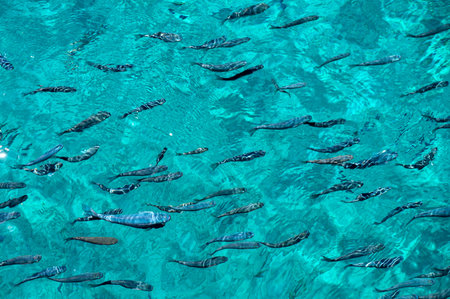 A school of fish swims within the transparent turquoise waters of the Ionian Sea at Corfu island, Greece, above view, bright day light reflections