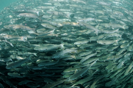 A school of anchovies swimming in a massive swarm.