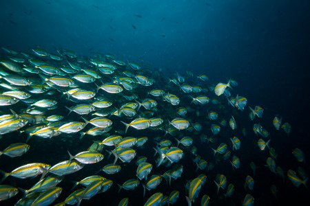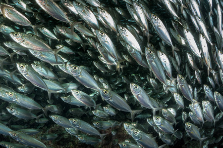 Massive school of sardines in a shallow reef. Sardine shoal or sardine run in Moalboal is a famous tourist destination in the southern town of Cebu, Philippines.