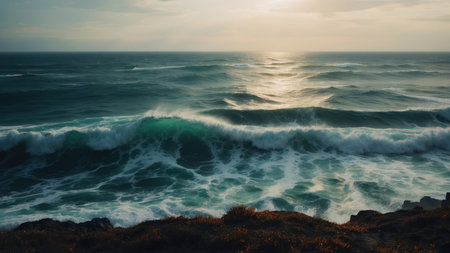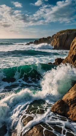 Rough seas crash against rocky cliff edge generated by artificial intelligence