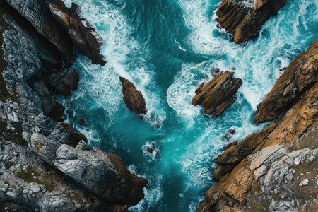 An aerial photograph showcasing the vast expanse of the ocean and the rugged beauty of the rocky coastline, Exquisite overhead shot of a high tide brushing against rough rocks, AI Generated