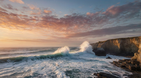 A scenic view of large waves crashing against a rocky coastline during sunset. The sky is filled with dramatic clouds, and the water is a mix of blue and white. The cliffs add to the picturesque landscape.