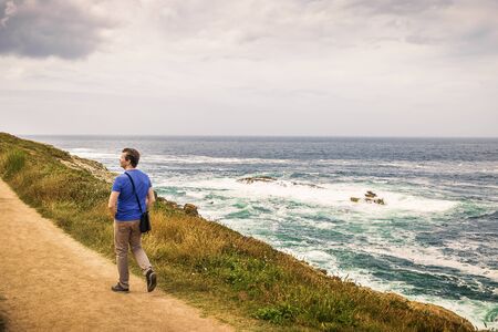 man in blue shirt walking by the sea on a dirt road