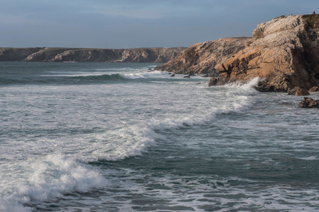Waves breaking on the rocky coast of the Atlantic Ocean in Portugal