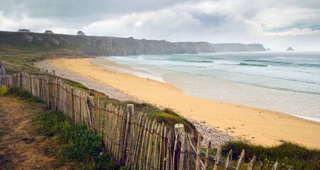 Atlantic ocean shore line in France. Beautiful sea coast with sand beach and huge waves. Scenic landscape of Crozon peninsula, one of the most popular tourist destinations in Brittany
