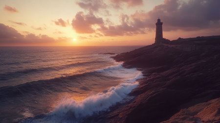 The iconic Tower of Hercules stands majestically against a vibrant sunset sky, with crashing waves expressing the power of the Atlantic Ocean along the rugged coastline.