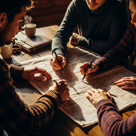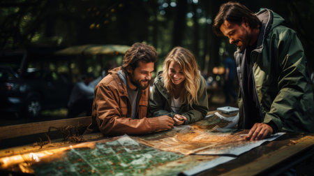 Three friends joyfully examine a map together in a peaceful forest setting, embracing adventure and camaraderie.