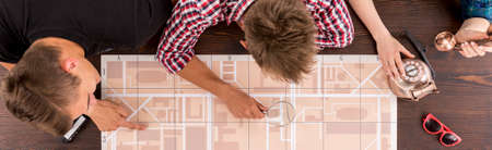 Top down view of manager pointing at house model and explain building design. Aerial view of architect engineer brainstorming about interior construction while tablet display house plan. Alimentation.