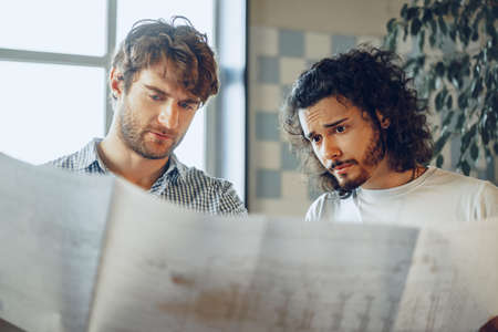 Group of young architects gathered by table with large sketch on blueprint discussing working points at meeting