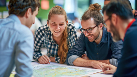A diverse group of professionals is gathered around a large interactive table, discussing and planning a cityscape project. They are using digital tools and physical models to visualize and strategize.