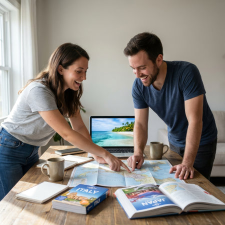 A joyful couple collaborates on travel plans, surrounded by maps, guidebooks for Italy and Japan, and a laptop showing a tropical paradise.