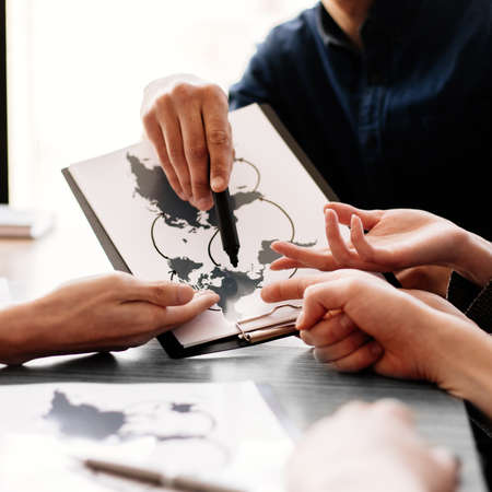 Businesspeople analyzing paper reports with diagrams. Business team standing at table, looking and pointing at documents. Closeup shot of table and hands. Analysis and teamwork concept