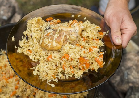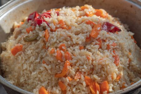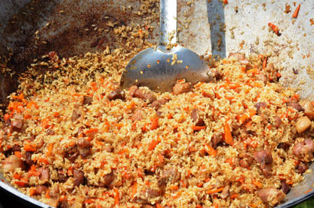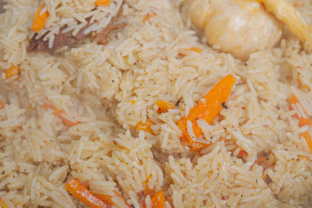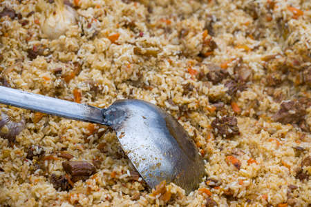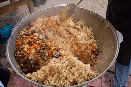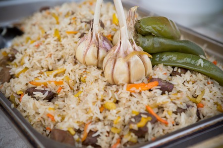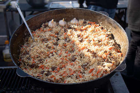 Rice with carrots and garlic. National dish of Uzbekistan. A delicious meal outside. Pilaf with meat.