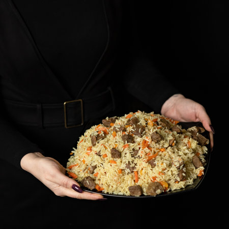 Pilaf, stewed Rice and meat Asian dish. Female hands holding platter of hot Uzbek pilaf on black background. Close-up shot. Soft focus.