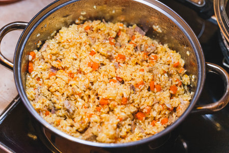 Kabuli pulao, pilaf, the national dish of Afghanistan, rice with meat, homemade, no people,
