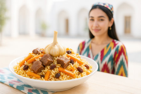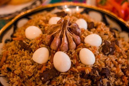 A beautifully arranged plate of Uzbek rice pilaf, showcasing tender meat, fragrant spices, and garnished with quail eggs and garlic, highlighting the artistry of traditional cuisine
