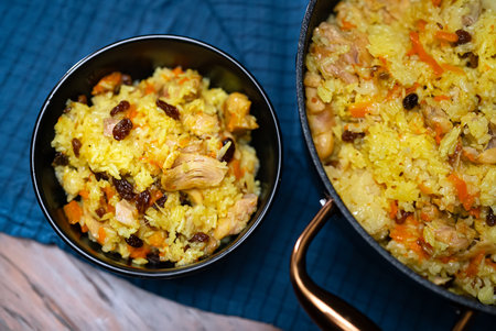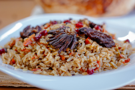 Traditional caucasian rice dish plov with dry fruits and meat