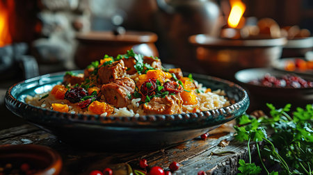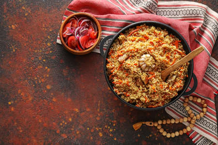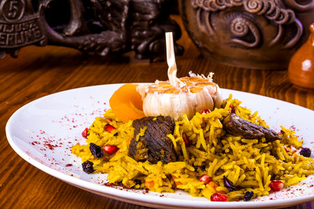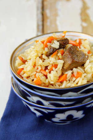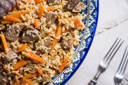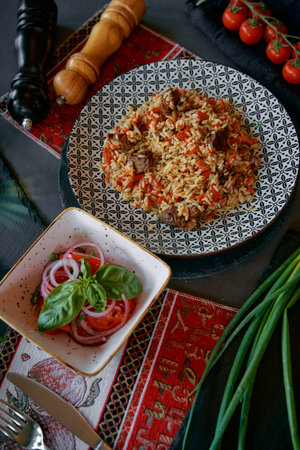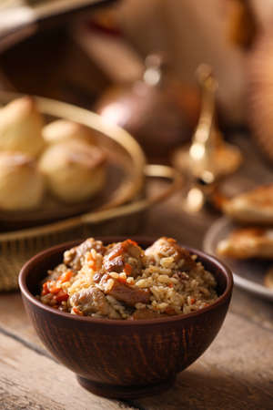 The concept of Oriental cuisine. National food made of rice with meat and spices