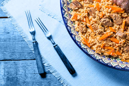 Pilaf in the handmade plate with antique forks on the wooden background. Horizontal, toned in blue