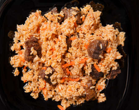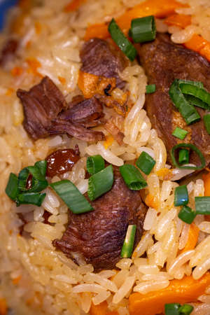Pilaf with beef, carrots, onions, garlic, pepper and cumin. A traditional dish of Asian cuisine. Selective focus