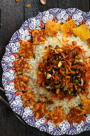 Iranian jewelled rice topped with orange zest, nuts and raisins in traditional plate