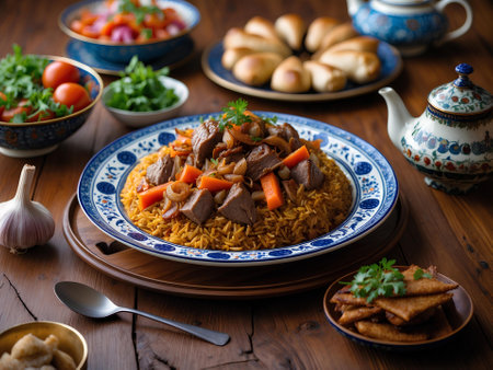 Indulge in the flavors and aromas of Tajikistans signature rice pilaf, Osh, with this colorful and fragrant bowl of tender pieces of lamb or beef and a variety of spices. The image is captured from a top-down perspective, showcasing the vivid colors of the ingredients, such as carrots, raisins, and chickpeas, and their unique blend of spices, such as cumin, coriander, and turmeric. The bowl of Osh is placed on a brightly patterned tablecloth, evoking a festive and communal dining experience. Smaller bowls of yogurt, pickles, and fresh herbs are arranged around the main dish, adding more visual interest and showcasing the unique flavors of Tajikistan cuisine. The emotions evoked by this image are warmth, joy, and togetherness.
