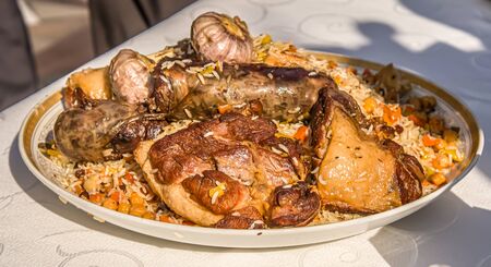 Traditional oriental dish, Khan pilaf in a pita on tableware in a restaurant in Azerbaijan