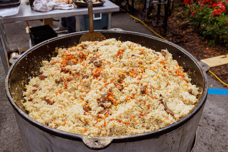 In street food festival, Uzbek pilaf is being prepared in cauldron