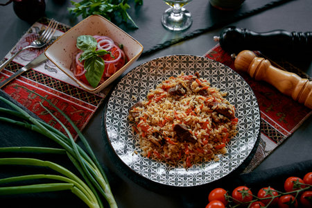 A Delicious Plate of Spiced Rice with Tender Meat, Fresh Tomatoes, and Colorful Salad on a Vibrant Dinner Table Set with Textiles and Ingredients