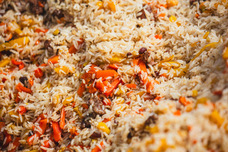 Close-up view of asian pilaf with rice and meat, great image for your needs.