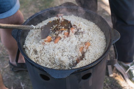 Pilaf with rice is cooked on a cast-iron cauldron. The dish is cooked at the stake