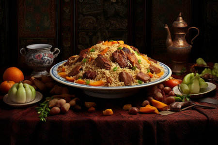 Azerbaijani pilaf with meat and dried fruits on a large serving platter. AI generated.