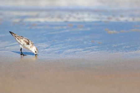 Sand Piper hunting for food in the sand along the Florida coastline at Playalinda Beach, Canaveral National Seashore.