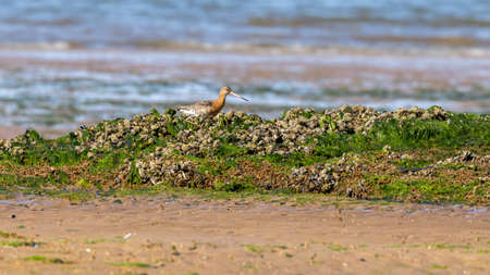 Female Bar-tailed Godwits or Limosa lapponica walks at seashore, portrait, selective focus, shallow DOF.