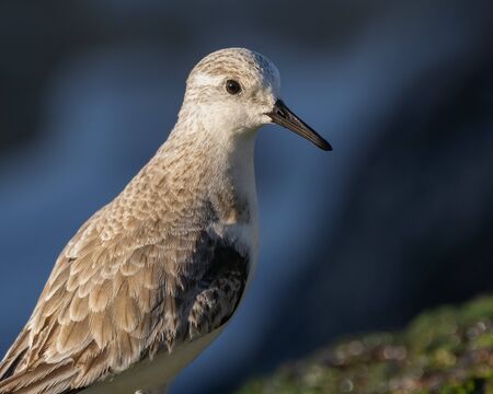 Shorebird Ruff or Philomachus pugnax at sea shoreline close-up portrait, selective focus, shallow DOF.
