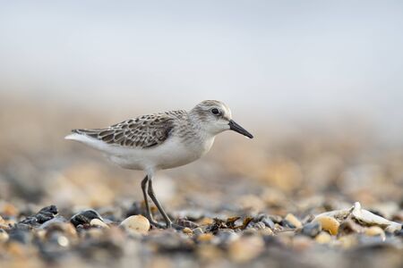 A small Semipalmated Sandpiper walks on a pebble covered beach with a a smooth light background in soft overcast light.