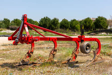 Agricultural harvesting industrial equipment concept. Agriculture machinery, plowing machine made of steel