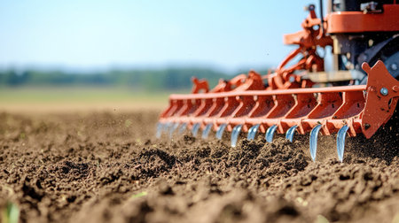 This image captures a close-up view of a tiller working on brown soil, illustrating the agricultural process of cultivating land. Dust rises as the machine prepares the earth for planting.