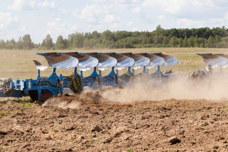 large blue plow plows the soil on the field, a lot of dust from the dry soil flies from the plow