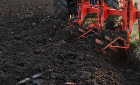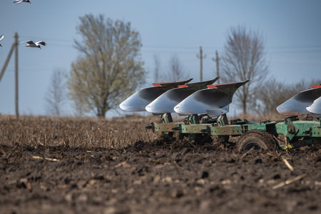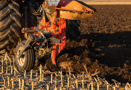 Plow cultivating fertile soil, turning earth in field preparing ground for new crop at sunset, creating a dynamic action