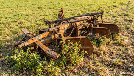 Vintage rusted plow reclaimed by nature in old farm field