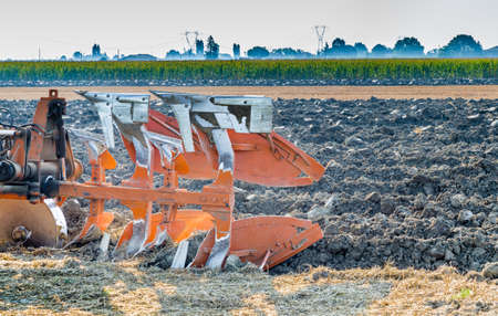 Rusty red plow is lying on the ground in a plowed field, ready for the next harvest